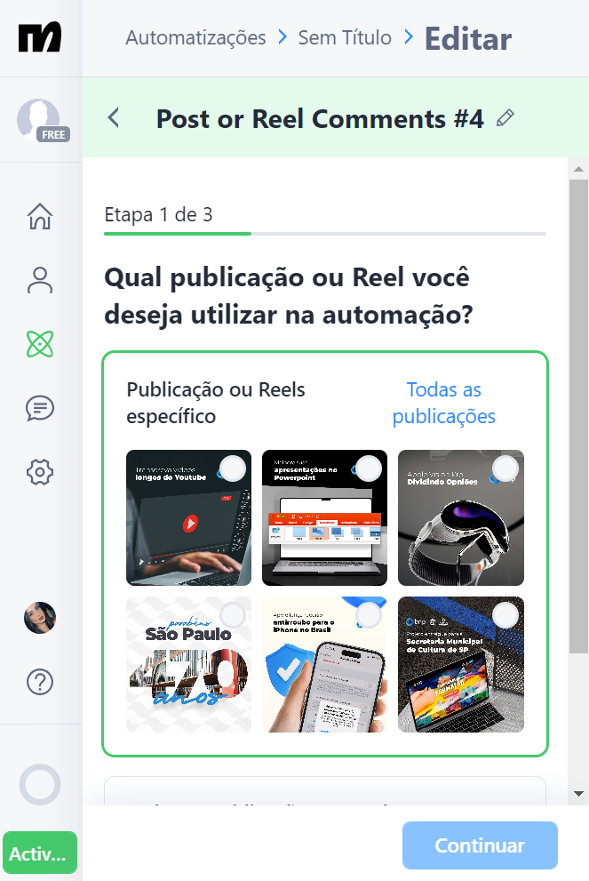 Etapa 9: Na lateral esquerda, abrirá um menu com as opções de publicação que você deseja vincular esta automação. Escolha a sua em questão e aperte “Continuar”.