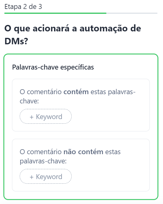 Etapa 10: No campo “Palavras-chave específicas” inclua todas as variações possíveis de como o usuário pode escrever a palavra desejada, considerando letras maiúsculas e minúsculas, plural e singular, entre outras possíveis escritas.