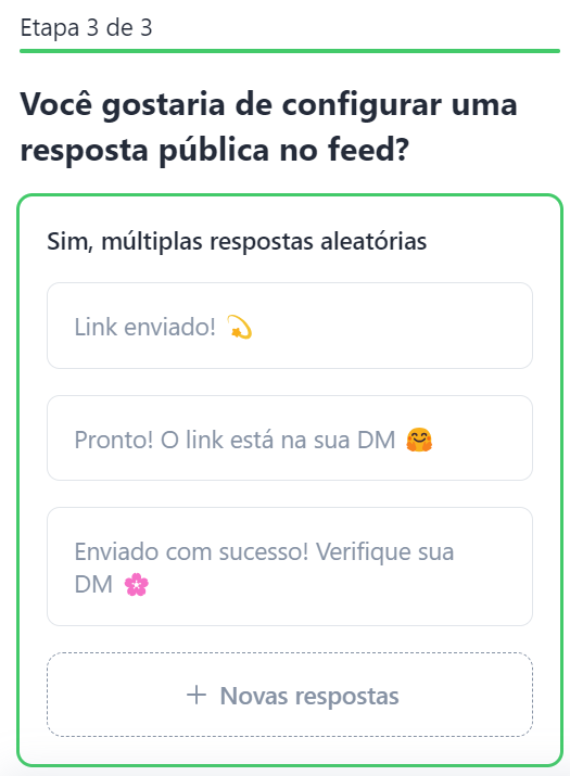 Etapa 11: Agora, você escreverá as variações de como o seu perfil responderá ao público, podendo colocar mais de uma opção para não se tornar repetitivo. Clique em “Salvar”.