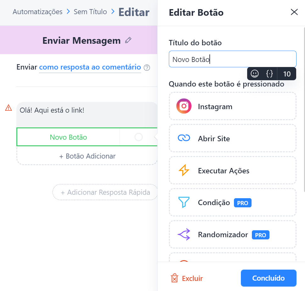Etapa 13: No campo disponível, digite a mensagem que o seu seguidor receberá via DM. Após isso, selecione a opção “Novo Botão”, escolha a ação desejada e clique em concluído!