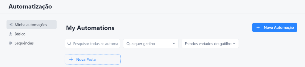 Etapa 5: Agora que você acessou o painel inicial da plataforma, vamos criar uma nova automação. Clique no botão “Automatização” no menu lateral da página, e agora selecione “+ Nova Automatização” no canto superior da tela.