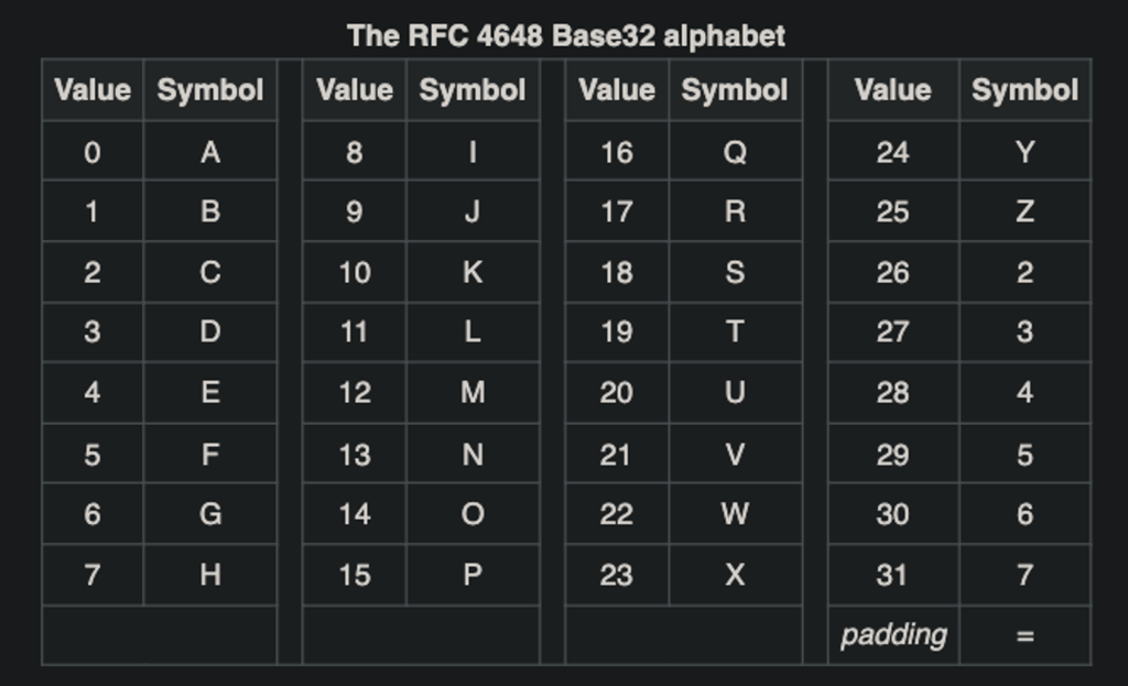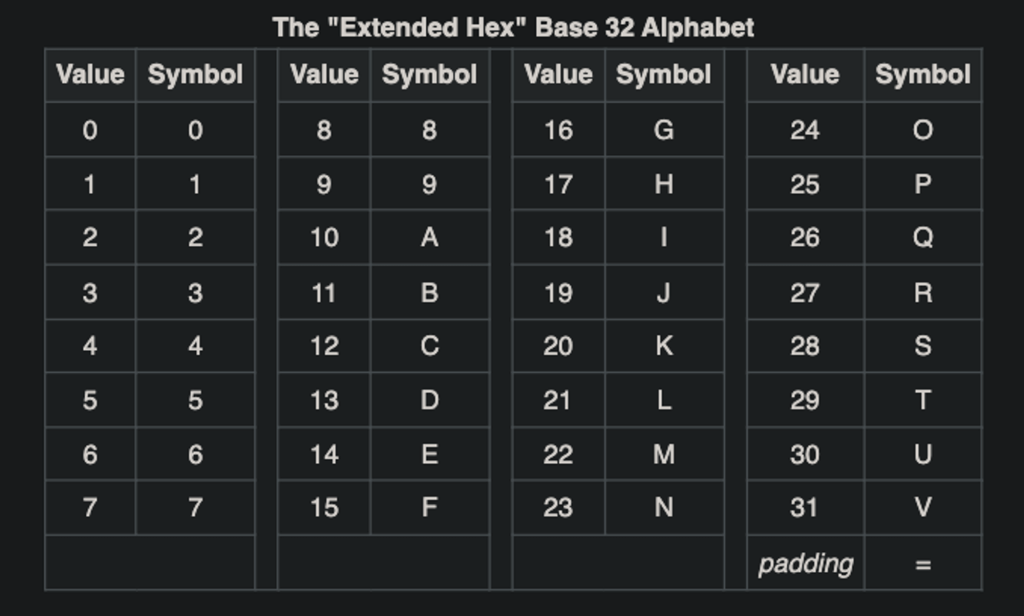 Além do esquema principal de codificação, o base32 têm formas alternativas de dicionário, como o z-base-32, Crockford’s Base32, Electrologica, Geohash, Word-safe.