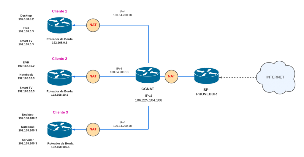 Com o CGNAT entregue pela operadora, existe mais um equipamento dentro da sua estrutura, um intermediário baseado no RFC 6598, que faz a comunicação entre o ISP (Internet Service Provider) e o cliente final, não mais entregando um ip público, e sim um ip local (100.64/10).