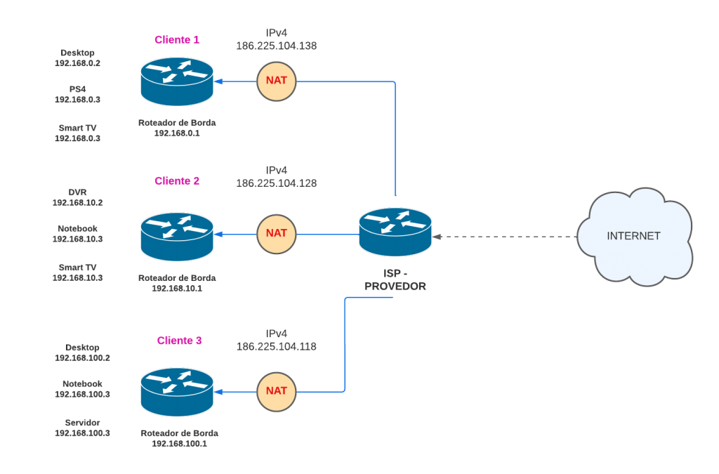 Com isso, é implementado o famoso “NAT do NAT”, onde o cliente final não possuí mais poder sobre as configurações de port forwarding, mesmo que possua um equipamento próprio em sua infraestrutura.