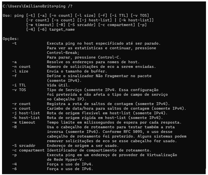– Ping /? : Se desejar ver todas as variações do ping, essa é uma boa pedida, mas não veremos todos aqui, mas aqueles que julgo mais relevantes e que sempre uso nos meus troubleshootings.