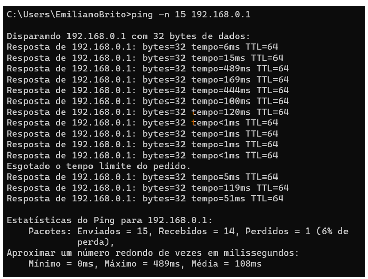 – Ping -n [número de pings] [ip]: Por padrão o comando ping vai fazer 4 testes de conexão com outro endereço IP, mas agora com esse comando nós podemos expandir para quantas conexões queremos fazer. Aqui no exemplo abaixo eu coloquei 15 tentativas de conexão:
