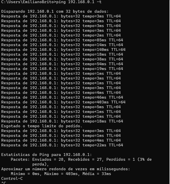 – Ping [IP] -t: Diferente do comando acima, este fica fazendo teste de conexão infinitamente ou até aplicar o comando Ctrl + C para faze a parada. Supomos que você deseja saber como está uma conectividade no decorrer de um período. Com isso você não precisa estimar quantos testes precisam ser feitos, apenas deixa o comando parar e no final de um período o você pode fazer a parada do comando e ver como está a conectividade. Veja: