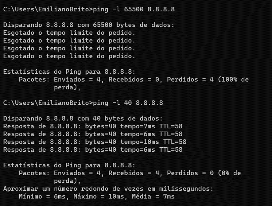 – Ping -l [IP]: Talvez não tenham notado na primeira imagem, mas perceberam que os pacotes enviados têm tamanho de 32 bytes? Esse tamanho é padrão, mas você pode ajustar esse tamanho conforme necessário para avaliar o tempo de resposta de pagotes maiores que possa trafegar na rede. Você pode determinar um tamanho de até 65500 bytes. Veja no exemplo abaixo que pinguei um IP externo com 40 bytes e 65500 bytes. Perceba que com um tamanho tão alto não obtive resposta, mas com um pacote menor tive um retorno sobre meu teste de conexão:
