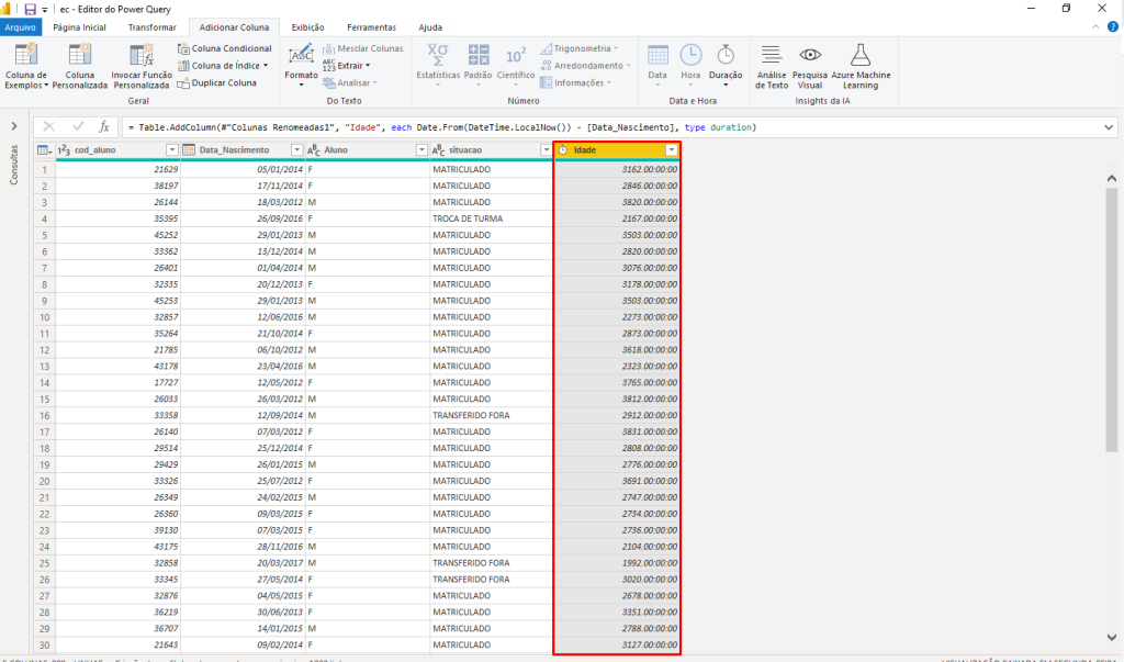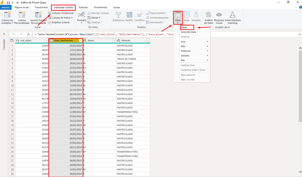 Após importar a sua base de dados para dentro do Power Query, selecione o campo que corresponda a data de nascimento, em seguida selecione a aba de adicionar coluna, neste guia selecione o campo chamado data. No menu serão exibidas algumas opções, selecione idade.