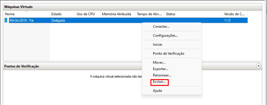 Após o processo e com a máquina desligada, clique com o botão auxiliar sobra ela e selecione excluir. Devemos excluir a máquina por garantia, pois se ela for ligada por engano, todos os discos provenientes deste disco pai se perderão.