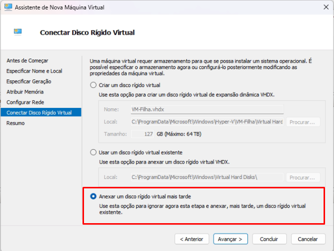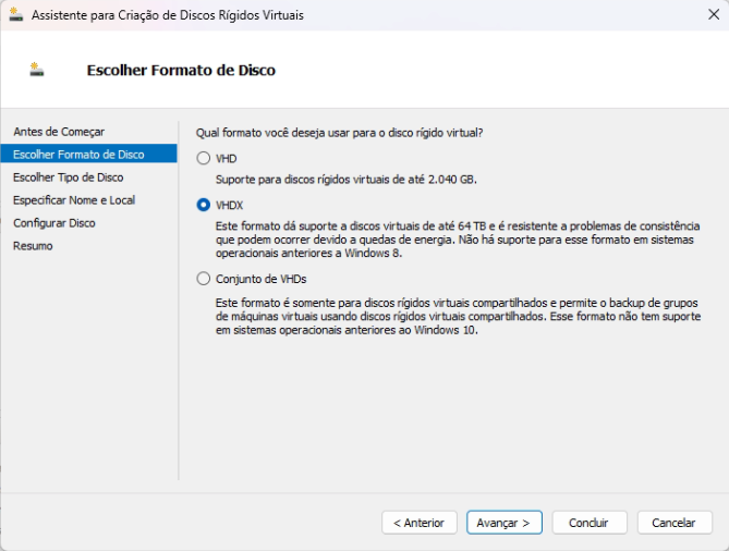 Em formato de disco, deixe o mesmo tipo que foi criado do disco pai (Geração 1 – VHD, Geração 2 – VHDX) – Para confirmar, vá até o local onde o disco foi salvo e verifique sua extensão – e clique em avançar.