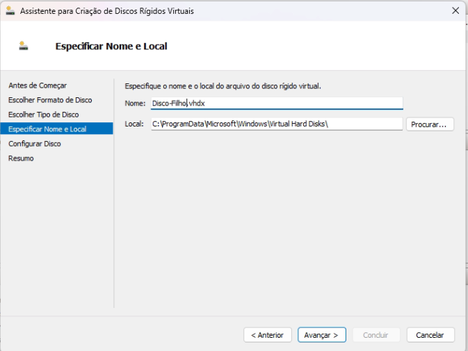 Escolha um nome para o VHD e um local para salvar o arquivo.