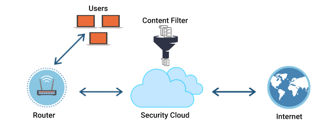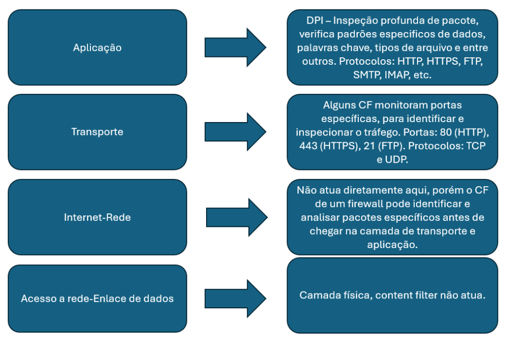 O content filter funciona como um intermediário entre o usuário e a internet, não é apenas uma ferramenta de firewalls, pode ser baseado também em servidor proxy, DNS ou uma aplicação instalada nos endpoints (computadores), ou seja, pode transitar em 3 das 4 camadas do conhecido modelo TCP/IP.