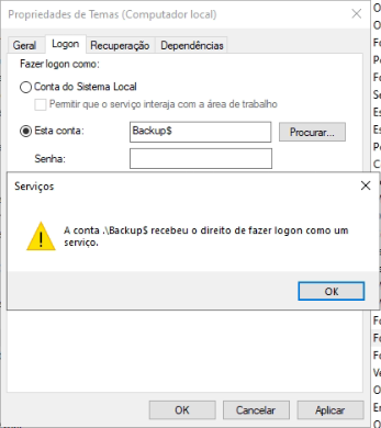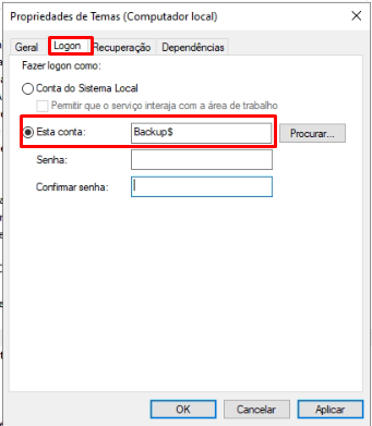 Clique em logon, selecione esta conta e entre com a conta criada, seguida do $ (Indica que é uma conta de serviço), a senha será criada automaticamente (apague a senha que vem por padrão) e alterada de 30 em 30 dias para fins de segurança.