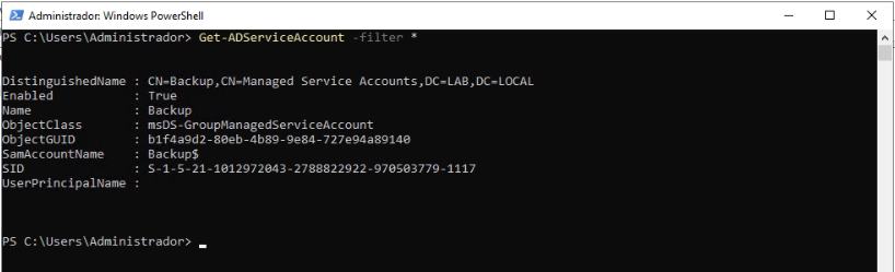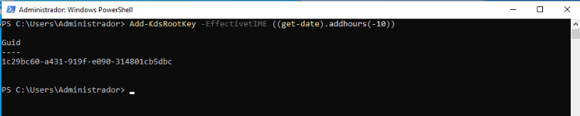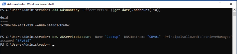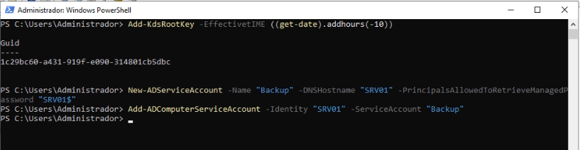 Com o serviço de KDS criado, o próximo passo é criar a conta de serviço no AD DS, utilizando o seguinte comando: