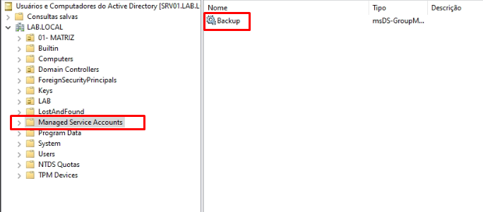 Após a habilitação, será exibida uma Unidade Organizacional Managed Service Accounts, se tudo deu certo, a conta de serviço estará dentro dela.