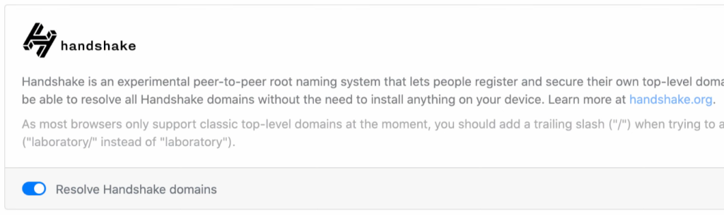 O maior problema é que ele não substitui o DNS normal. Atualmente, navegadores da Web como Chrome e Firefox não podem se conectar a domínios Handshake sem configuração adicional, tornando-os essencialmente domínios darknet sem suporte primário.