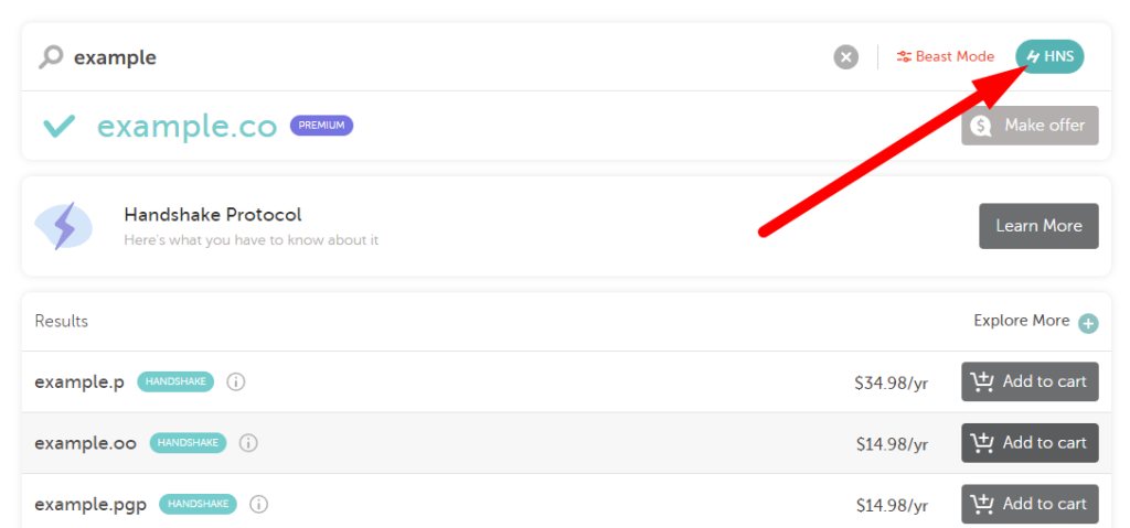 Se isso for muito complexo para você, você também pode adquiri-los por meio de um registrador tradicional com preço premium. Por exemplo, Namecheap fornece registro e gerenciamento de domínios Handshake por meio de seu sistema: