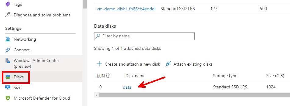 1. No portal do Azure selecionamos a máquina virtual, clicamos no menu lateral esquerdo em Disks, e depois no disco que iremos alterar: