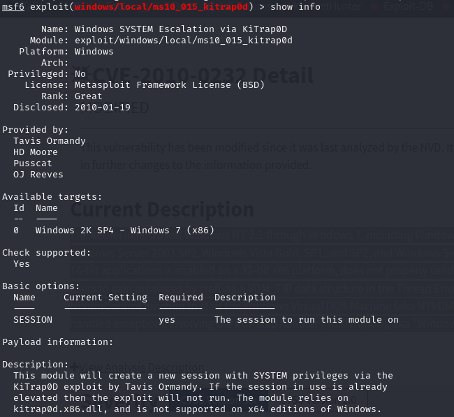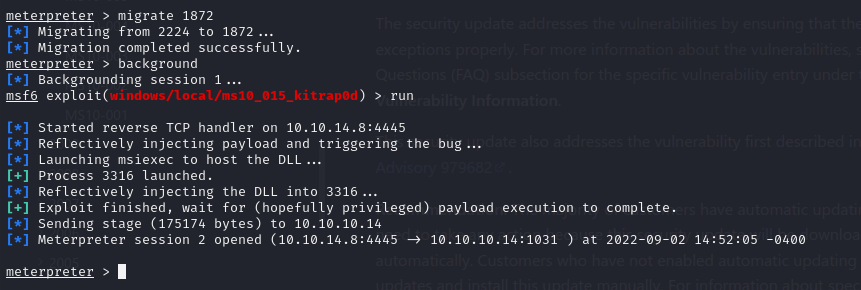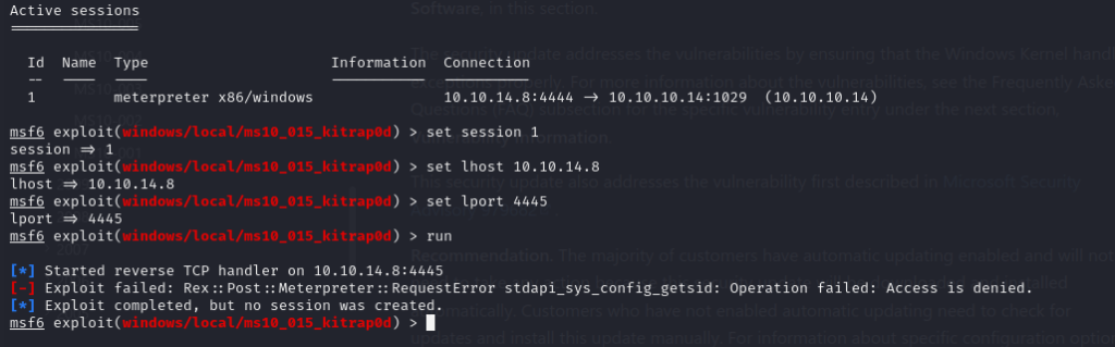 Teóricamente o host é vulnerável a todos a esses exploits, então resolvi utilizar o ms10_015_kitrap0d.
