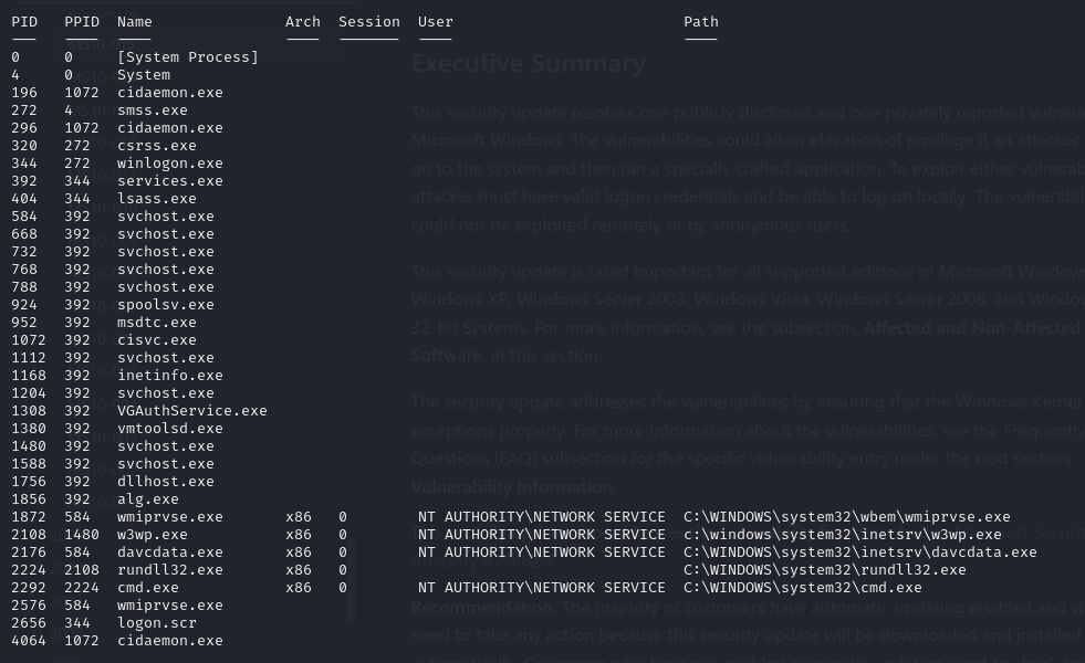 Nesse caso, utilizei o comando migrate. O comando migrate simplismente irá migrar meu acesso para outro processo que eu escolher. Nesse caso escolhi o processo wmiprvse.exe (pid 1872), o qual nosso usuário network services está executando.