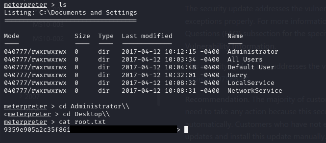 Após migrar o processo, consigo executar com sucesso o exploit ms10_015_kitrap0d e obter acesso privilegiado, assim obtendo as 2 flags user.txt e root.txt