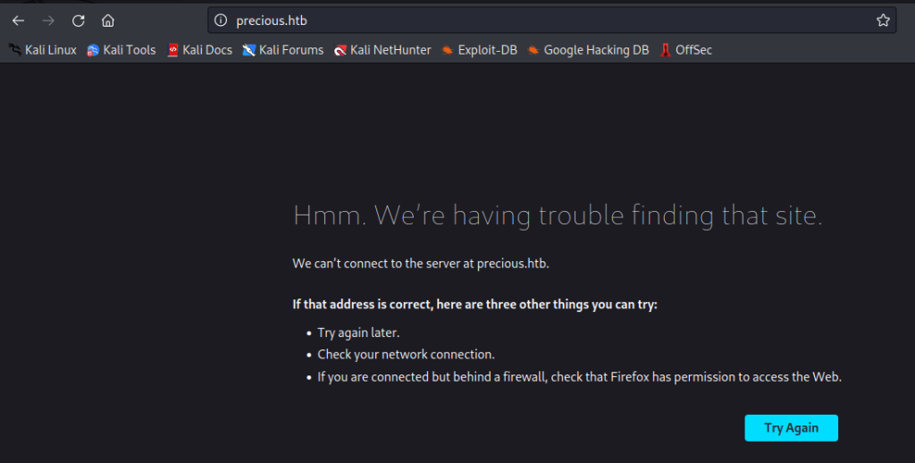 Ao tentar acessar o site na porta 80 através do navegador, fui redirecionado para o dns precious.htb.