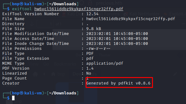 A ferramenta exiftool, trás detalhes sobre o arquivo, entre eles, como o arquivo foi criado. Então nos detalhes vi que o arquivo está sendo criado pelo software pdfkit v0.8.6.