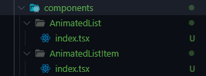 Vamos criar uma pasta AnimatedList e AnimatedListItem e definir os arquivos e estilos do componente, nesse caso estamos criando um elemento ul e li, eles serão os nossos Container e Item.