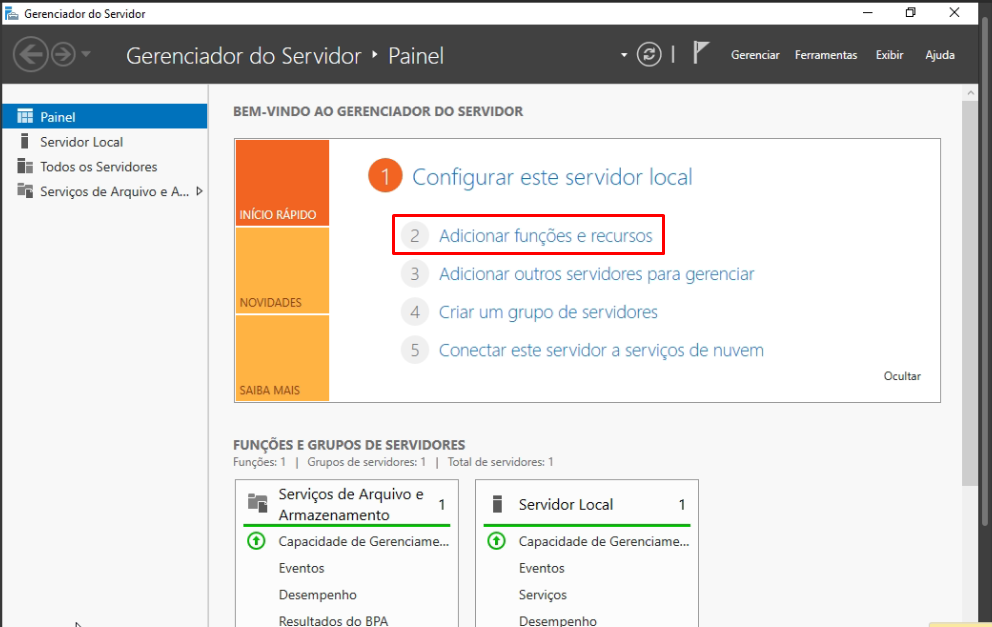 Com o Windows server devidamente configurado (usarei a versão 2022, mas da versão 2012 para cima as configurações são basicamente as mesmas), abra o Server Manager e clique em Adicionar funções e recursos.