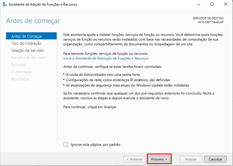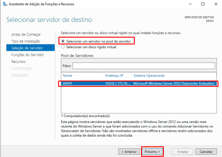 Selecione o servidor que terá o recurso instalado e clique em próximo.