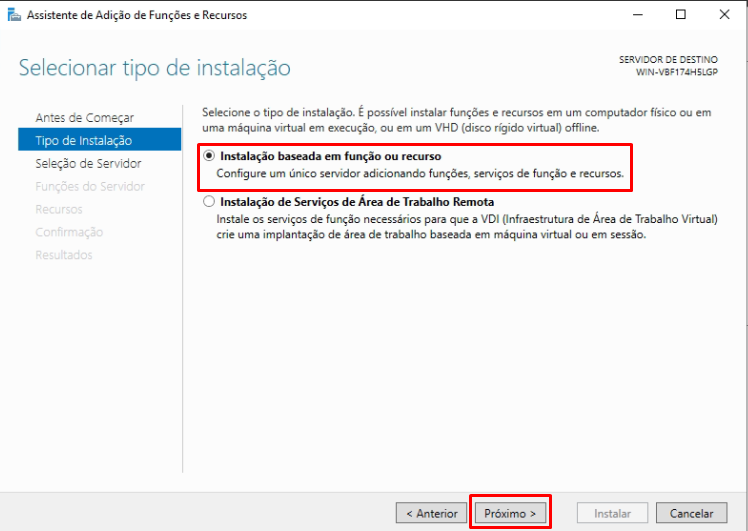 Deixar a primeira opção marcada (Instalação baseada em função ou recurso), e clique em próximo.