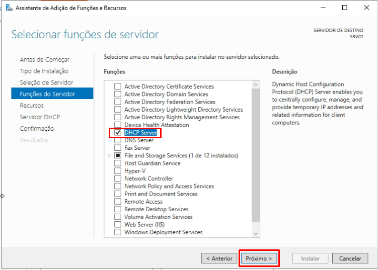 La lista de funções disponíveis, selecione DHCP Server e clique em próximo.