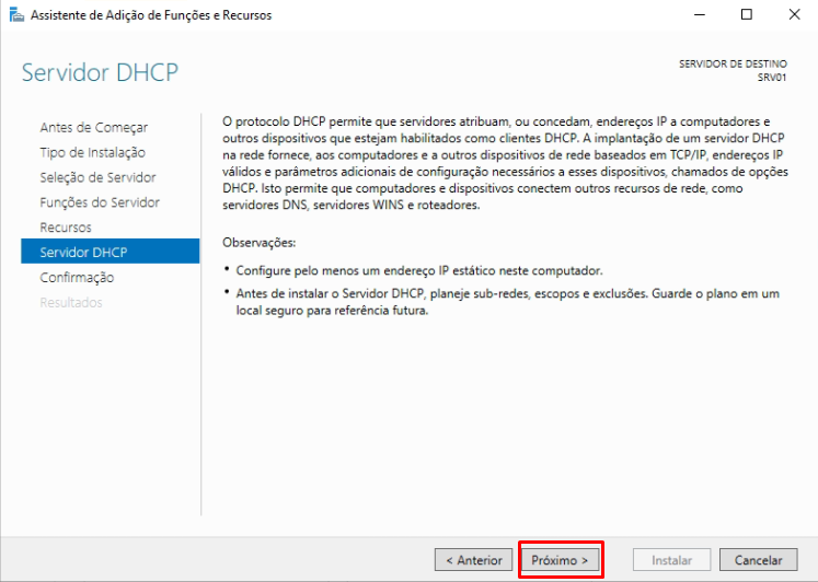 Na tela a seguir serão exibidas algumas informações importantes, como a exigência de se possuir ao menos um IP fixado no servidor, e um plano para o escopo do DHCP.