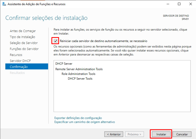 Deixe marcada a opção de reinicialização automática caso necessário e clique em instalar.