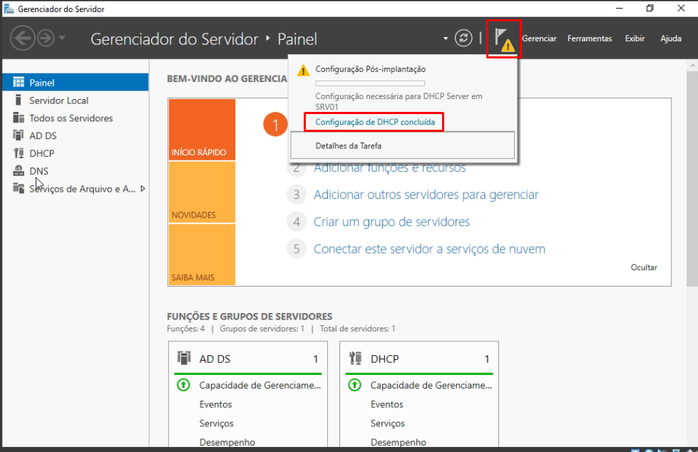 Após a conclusão, clique na bandeira com símbolo de alerta e posteriormente em Configuração de DHCP.