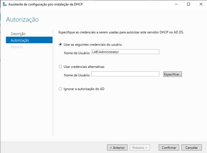 Antes da configuração do DHCP, devemos efetuar a autorização do mesmo, que nada mais é que a aprovação para o servidor efetuar a entrega dos endereços de IP.