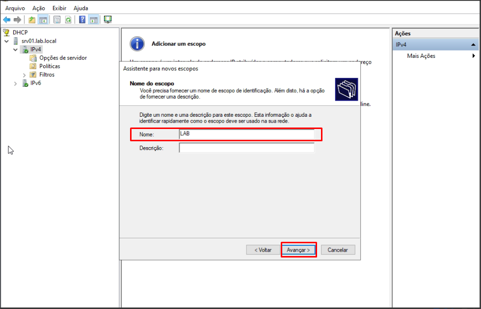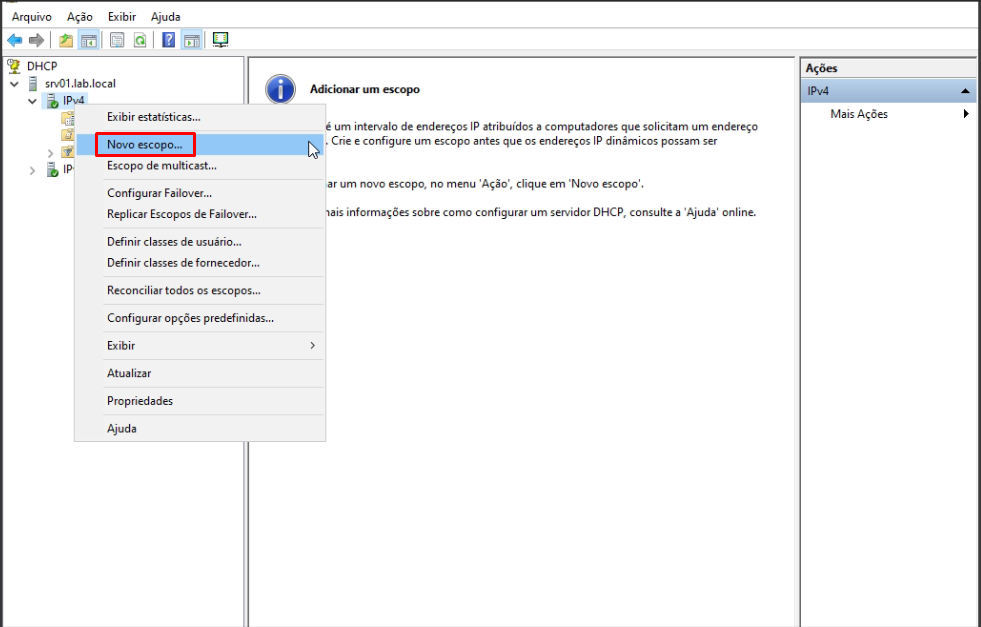Neste tutorial iremos configurar a entrega de IPv4, para isso, clique com o botão direito sobre IPv4 e selecione Novo escopo.