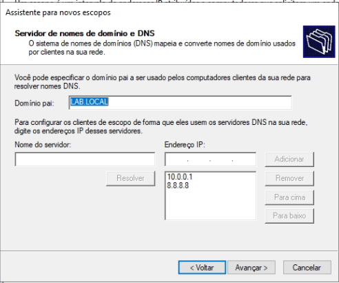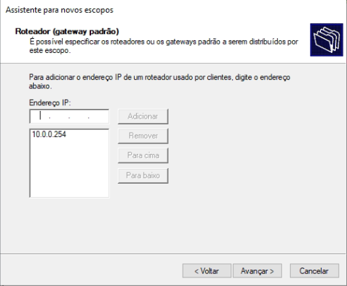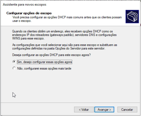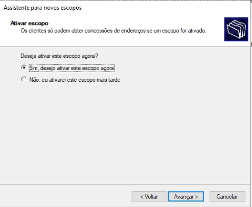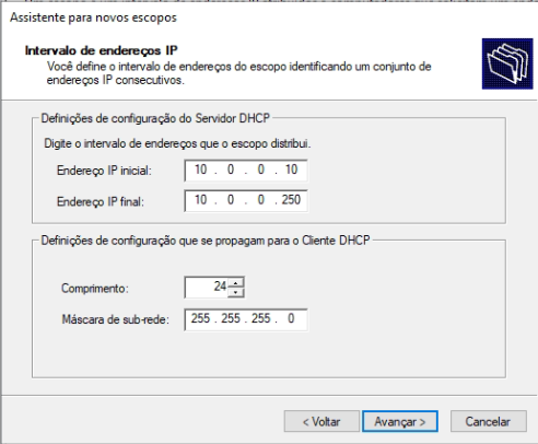 Na próxima tela é onde deveremos configurar o escopo, o range de IPs a ser entregue e Máscara de sub-rede.
