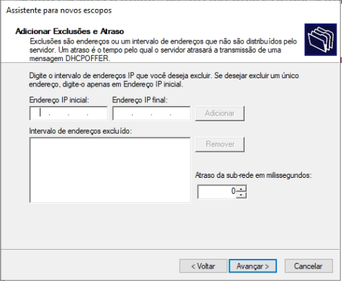 Na próxima tela é possível configurar uma exclusão de determinado range de IP, caso queira que ele não seja entregue pelo servidor DHCP. No meu caso, irei pular esta etapa.