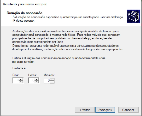 Na tela seguinte é onde configuramos a duração da concessão da oferta de IP. Ele determina quanto tempo um IP ficará disponível para um determinado endereço MAC após a entrega deste, ele estando ou não presente na rede.