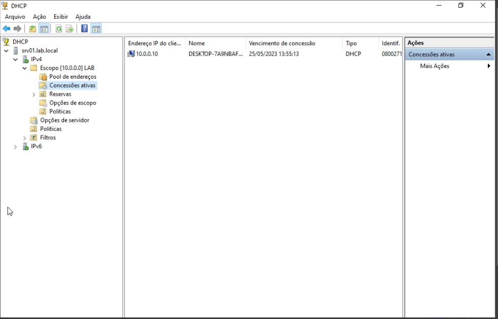 Com isso o DHCP estará ativo. Estou com uma máquina na rede para testes, e indo aos leases distribuídos (concessões ativas), conseguimos ver o IP atribuído e o tempo de concessão.
