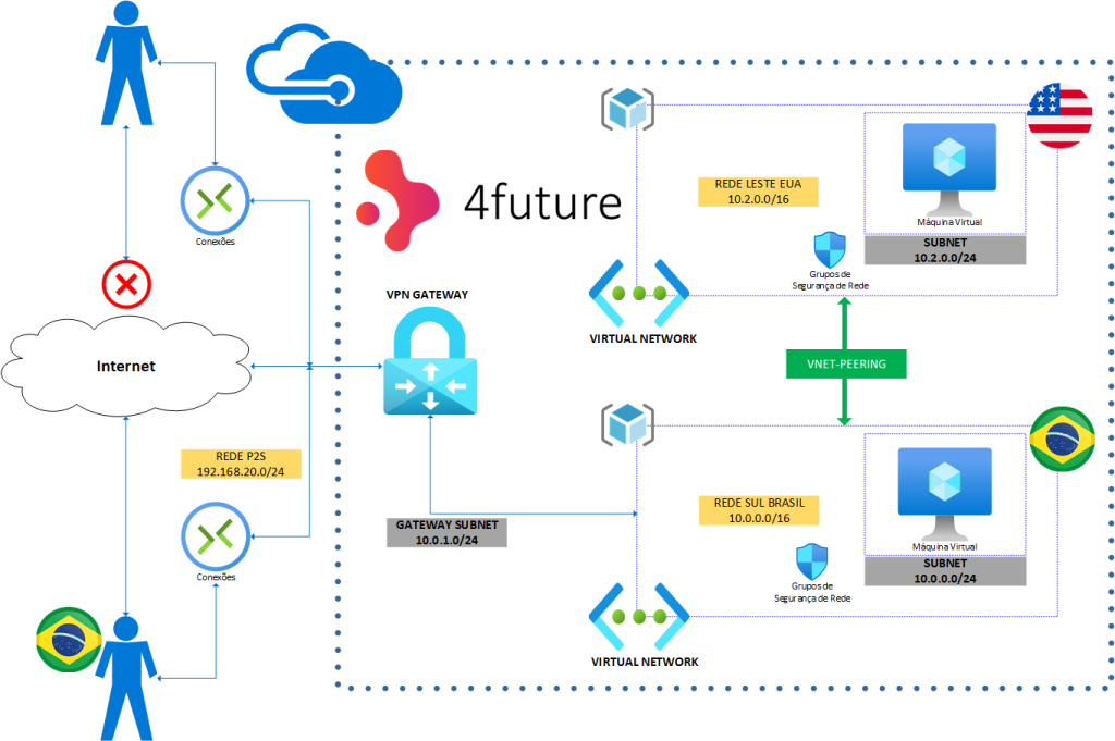 No cenário final, teremos conexões cliente customizadas, uma com acesso à internet e outra sem acesso à internet, ou seja, quando conectar na vpn o acesso à internet será bloqueado e só poderá acessar o ambiente no Azure, além disso vamos configurar um emparelhamento de rede (vnet peering) e fazer a comunicação funcionar do cliente até a ponta em outro país, tudo no mesmo gateway.