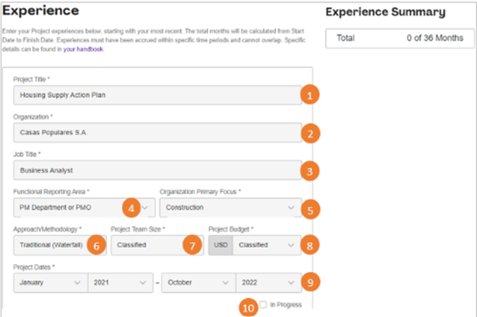 Na educação formal em gerenciamento de projetos, entre com as informações do seu curso preparatório. Aproveito mais uma vez para indicar a DGP Excelência em Projetos que te auxilia com planilhas de apoio em todo tipo de aplicação para o PMP. (Lembre-se que o seu certificado só poderá ser emitido ao final do curso, portanto você só poderá enviar a sua aplicação considerando o término do mesmo). Caso você tenha uma pós-graduação em Gestão de Projetos, que tenha tido a carga horária mínima de 35 horas, você pode inserir ela aqui. O mesmo vale caso seja CAPM. Depois de entrar com as informações sobre a sua educação, basta clicar no botão “Continue To Experience” ao final da página.