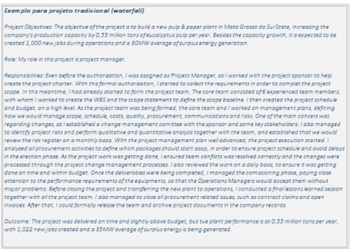 Após entrar com as informações gerais do projeto, basta entrar com a descrição da sua experiência naquele projeto, bem como deixar claro os objetivos do projeto, os resultados esperados, sua função no projeto, suas responsabilidades e as suas entregas (mínimo de 100 palavras, tipicamente entre 200 e 500).