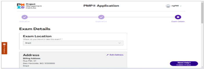 Agora você já está bem perto de finalizar a sua inscrição. Uma vez confirmados todos os requisitos e inseridas todas as informações e descrições das atividades para os projetos, é hora de seguir em frente para a seção “Exam Details” e finalizar a sua aplicação. Nessa seção, você irá entrar com as seguintes informações: