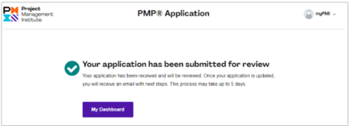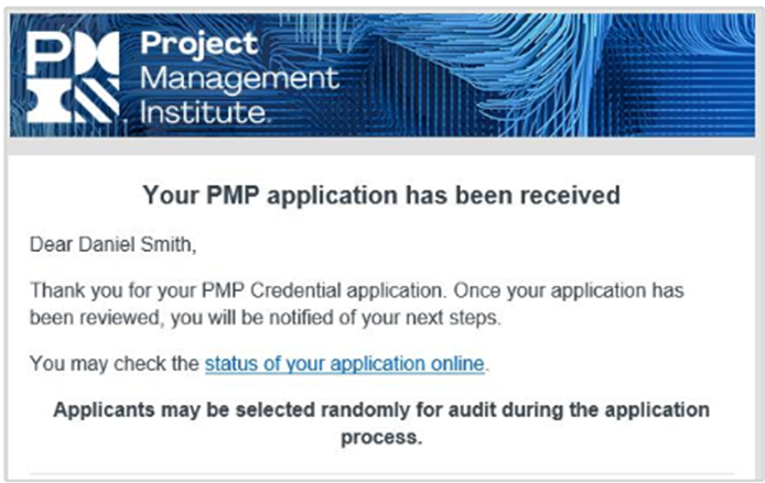 Você irá receber um e-mail informando que sua aplicação foi submetida e está sob revisão. O PMI tem até 5 dias para lhe retornar! Se a sua aplicação cair na auditoria, você será notificado por e-mail alguns minutos depois do envio.