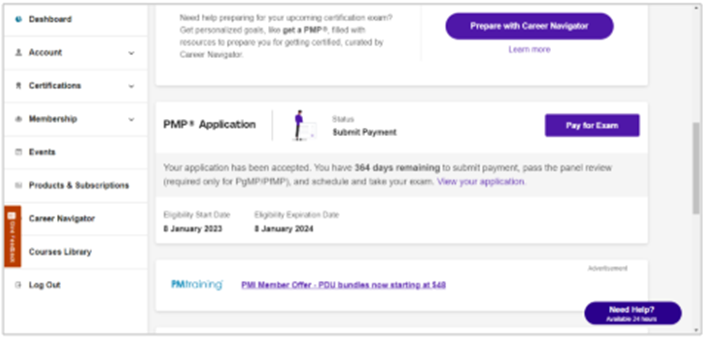Clique no botão “Go to myPMI” para acessar o seu dashboard. Role para baixo e você verá o seu período de elegibilidade (você tem 1 ano para poder agendar seu exame – caso esse prazo expire, terá que submeter novamente sua aplicação) e o botão para seguir em frente com o pagamento (“Pay for Exam”).