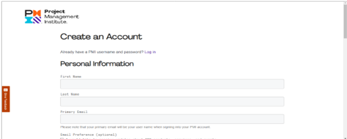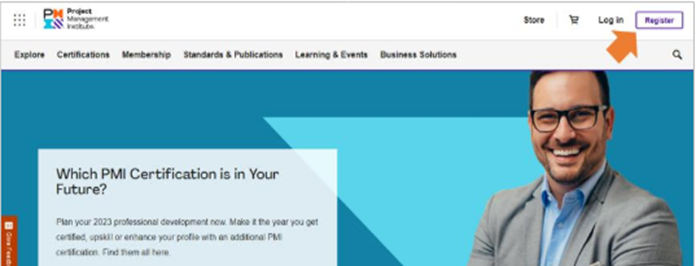 No canto superior direito, acesse o botão “Register” para criar sua conta no PMI.